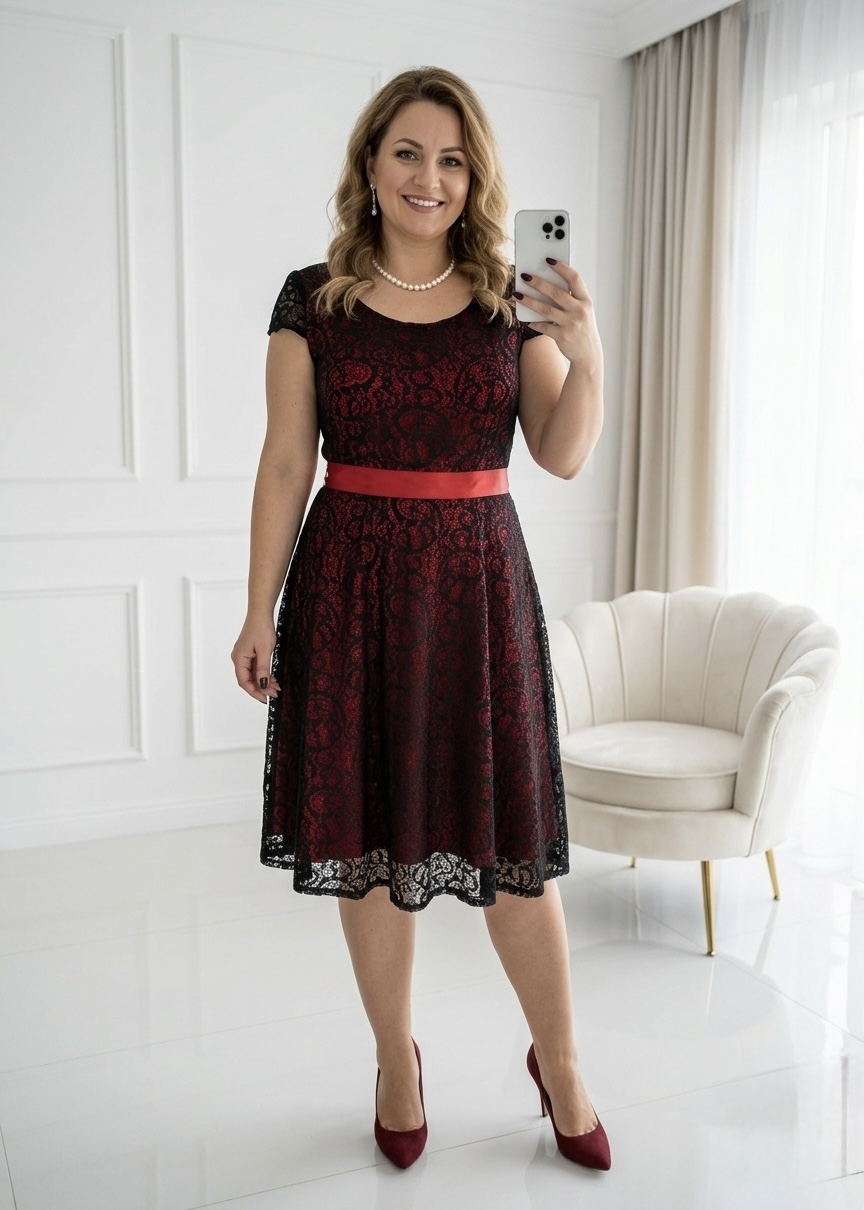 • Talie Accentuat de Cordonul din Satin: Talia este pusă în valoare de un cordon lat din satin roșu vibrant, care definește silueta și adaugă o notă de lux. ⏳