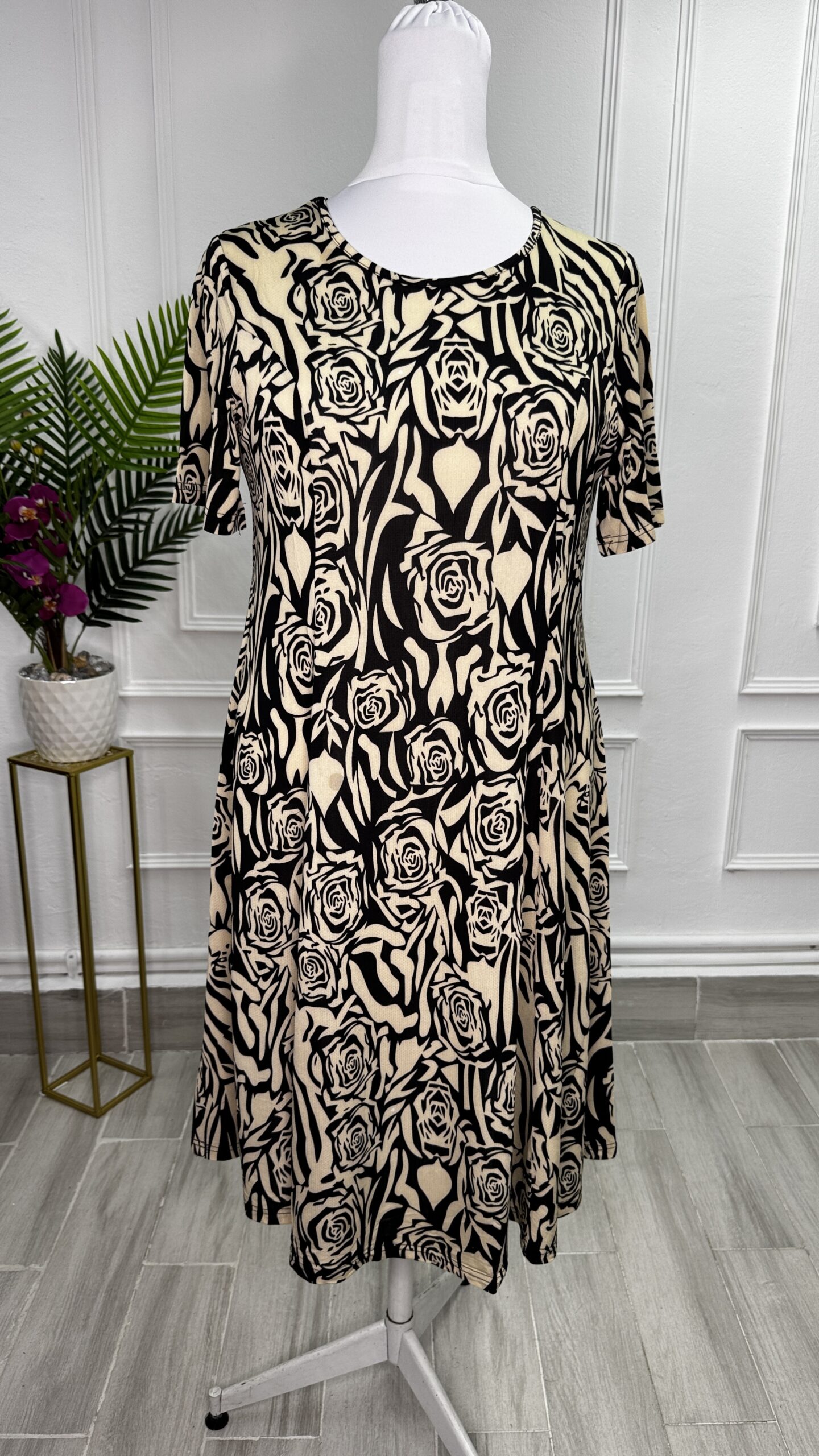 Rochia este disponibilă in lungimea expusa in fotografii . Mânecile scurte și croiala in 6 clini adaugă un plus de feminitate și lejeritate.