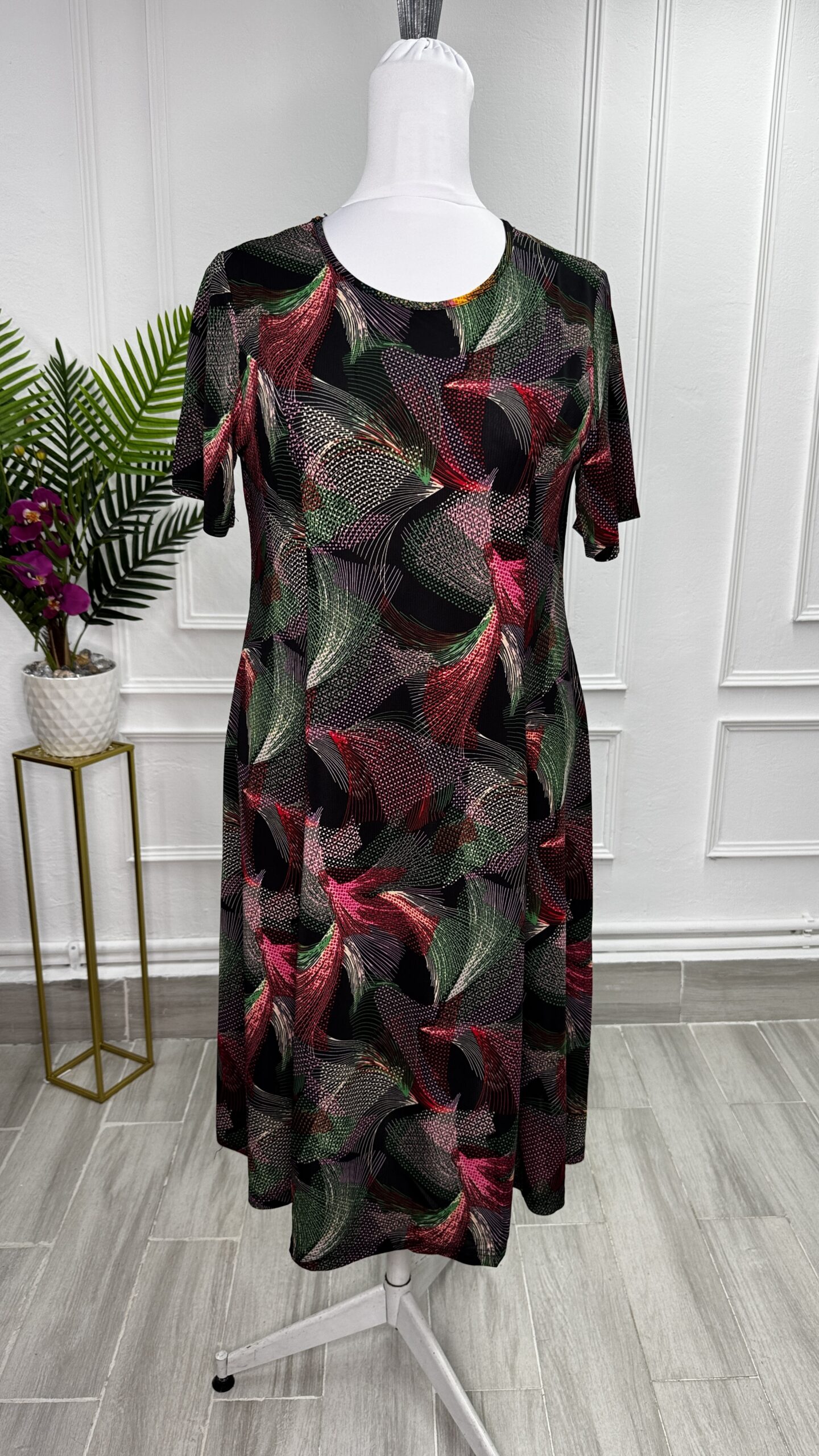 Rochia este disponibilă in lungimea expusa in fotografii . Mânecile scurte și croiala in 6 clini adaugă un plus de feminitate și lejeritate.